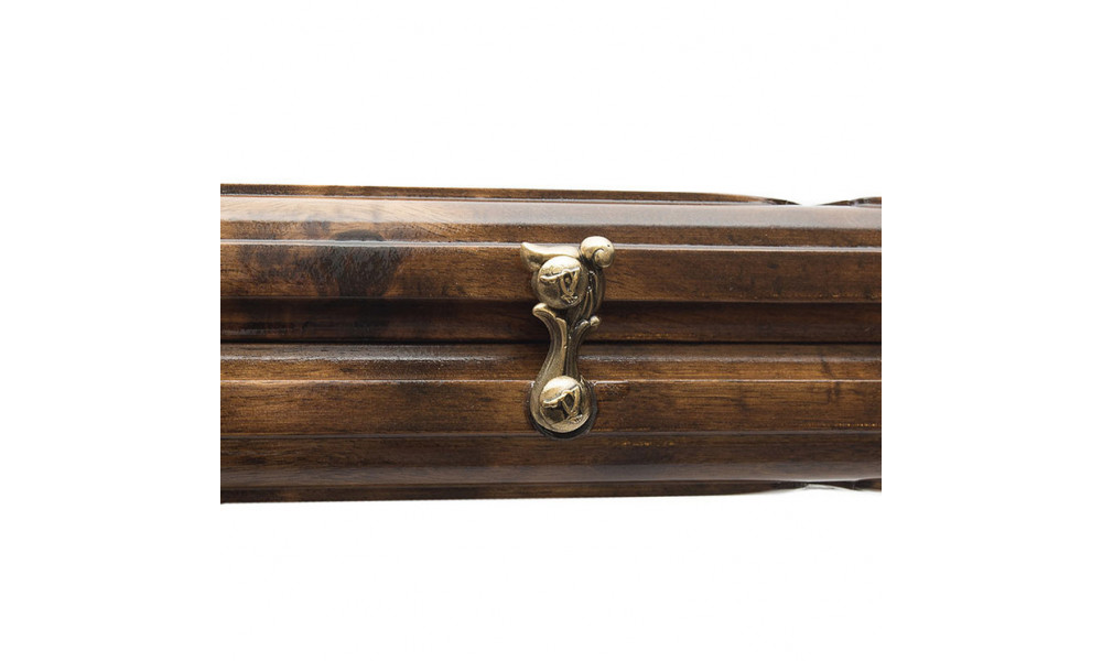 Ореховая древесина обладает хорошей прочностью и долгим сроком службы, но к тому же, ее достаточно просто обрабатывать. Именно благодаря ее податливости, удается придать ей необычный внешний вид, украсить различными орнаментами и изображениями с использованием мелких элементов. Створки скрепляются между собой при помощи бронзовых петель, а закрывается на 2 крючка из того же материала.