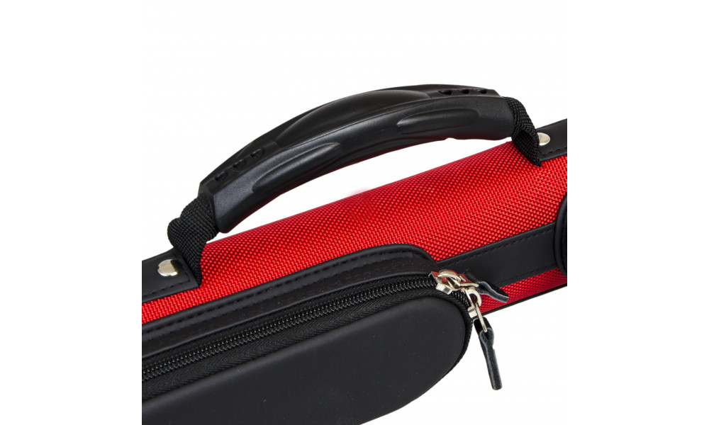 Есть ручка сбоку и наплечный ремень с регулировкой длины. На ремне есть специальная вставка для комфортной носки на плече. Каждая часть кия хранится в отдельном отсеке. С внешней стороны имеются карманы для аксессуаров и удлинителя. Большой карман внутри снабжен дополнительной молнией для надежной фиксации.